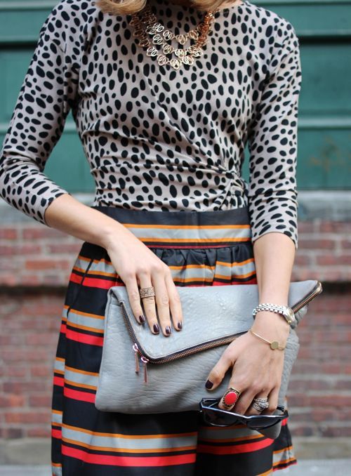 Έαν είσαι πιο τολμηρή, μπορείς να περάσεις στο επόμενο επίπεδο και να συνδυάσεις prints. Ο καλύτερος τρόπος είναι να επιλέξεις δύο prints που έχουν ένα κοινό στοιχείο μεταξύ τους, όπως το χρώμα. Μία τέτοια επιλογή είναι ένα πουά πουκάμισο με ένα φλοράλ παντελόνι, αρκεί να έχουν ένα κοινό χρώμα, πχ πορτοκαλί. Εάν θέλεις ένα ακόμα πιο τολμηρό look, δοκιμάσε αντίθετα μεταξύ τους prints, όπως ένα καρό πουκάμισο με μία animal print φούστα. Και πάλι όμως να θυμάσαι ότι χρειάζεται να έχουν κάτι κοινό μεταξύ τους.