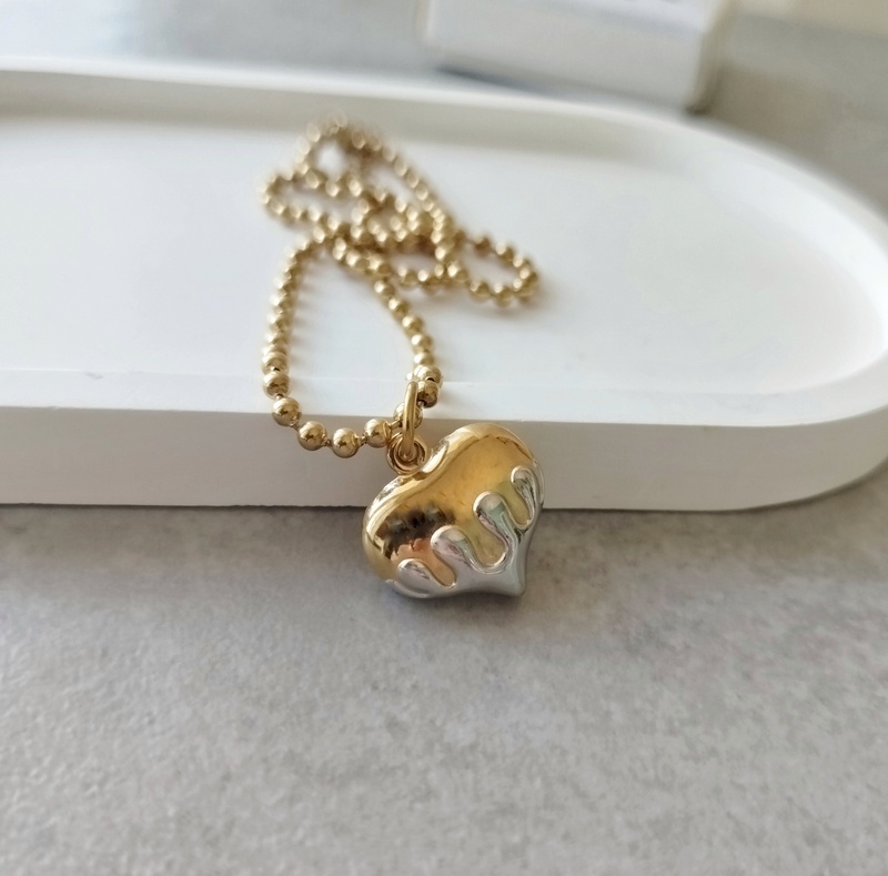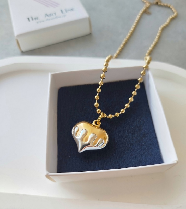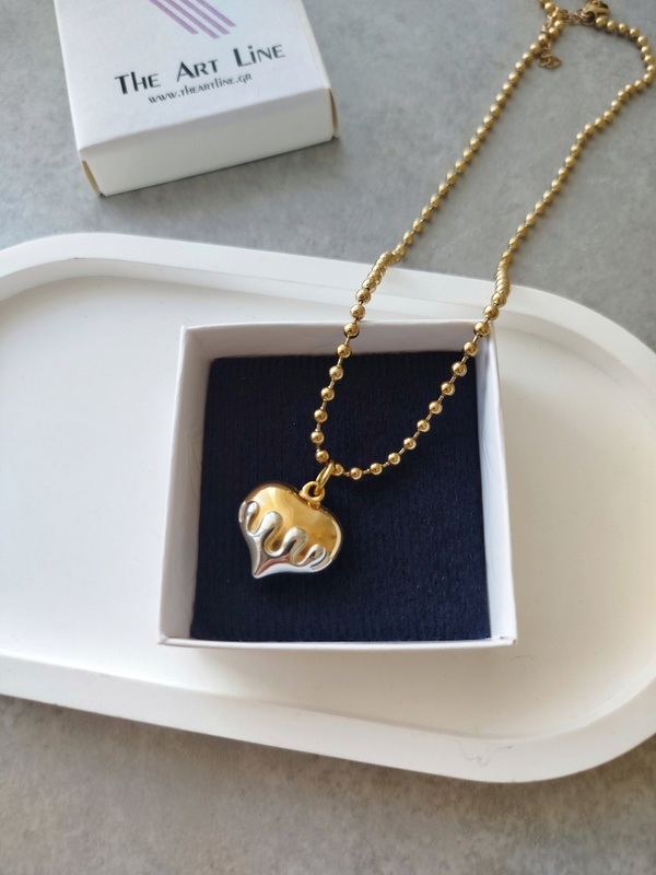 Η αλυσίδα από επιχρυσωμένο ανοξείδωτο ατσάλι χαρίζει στο κόσμημα πολυτελή όψη, ενώ παραμένει ανθεκτική, υποαλλεργική και άνετη για καθημερινή χρήση. Το μενταγιόν σε σχήμα καρδιάς δεσπόζει στο κέντρο, με διχρωμία σε χρυσό και ασημί τόνο, δημιουργώντας μια υπέροχη αντίθεση που τραβά αμέσως το βλέμμα.