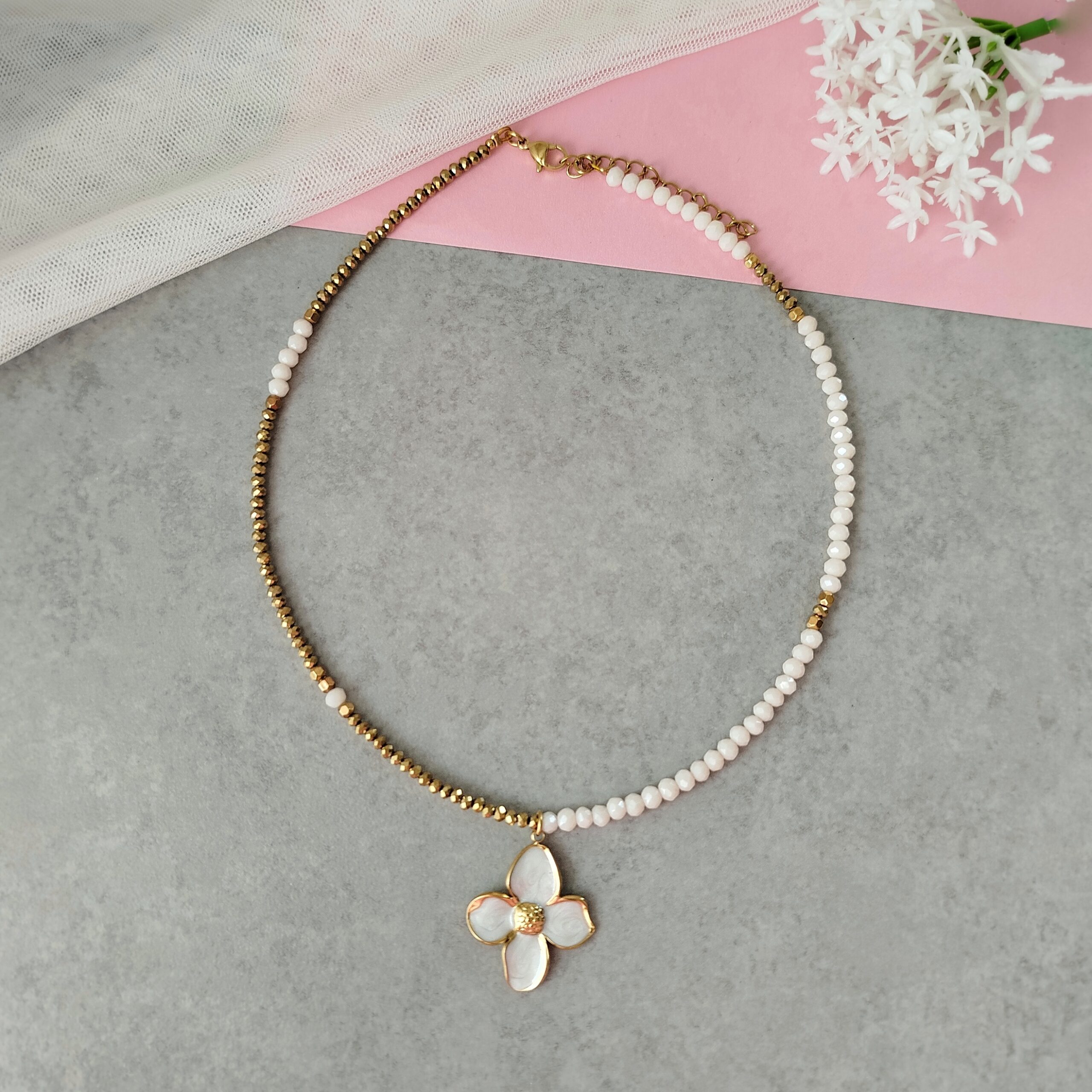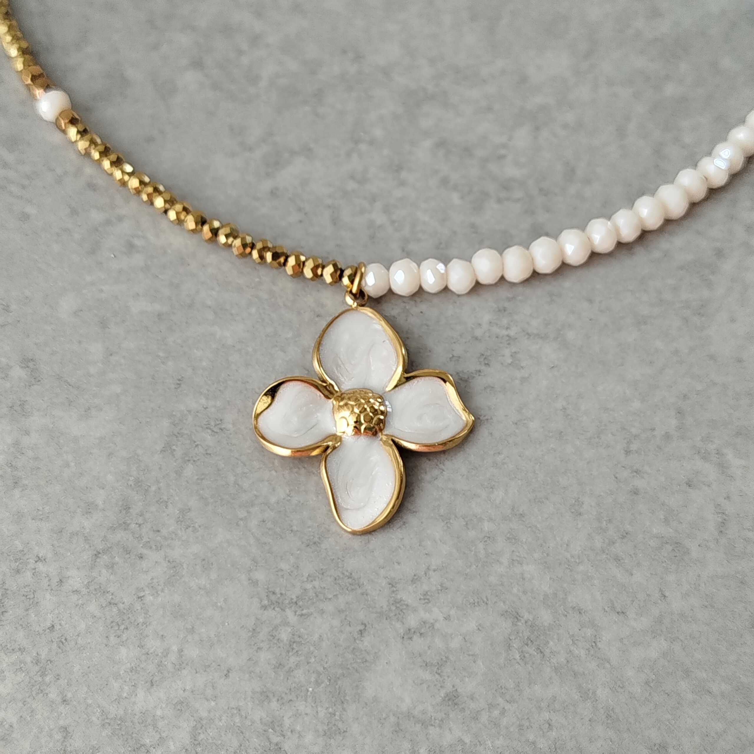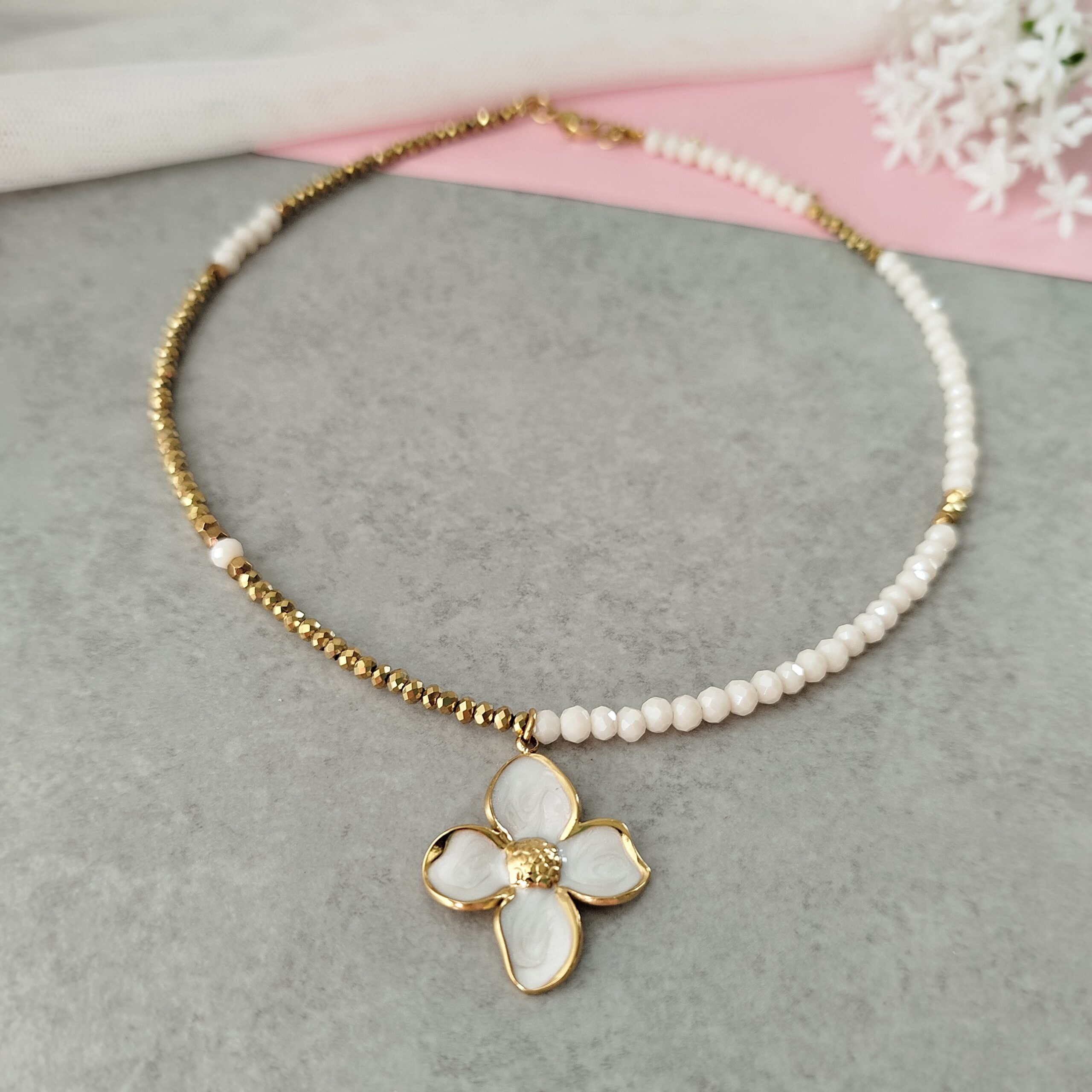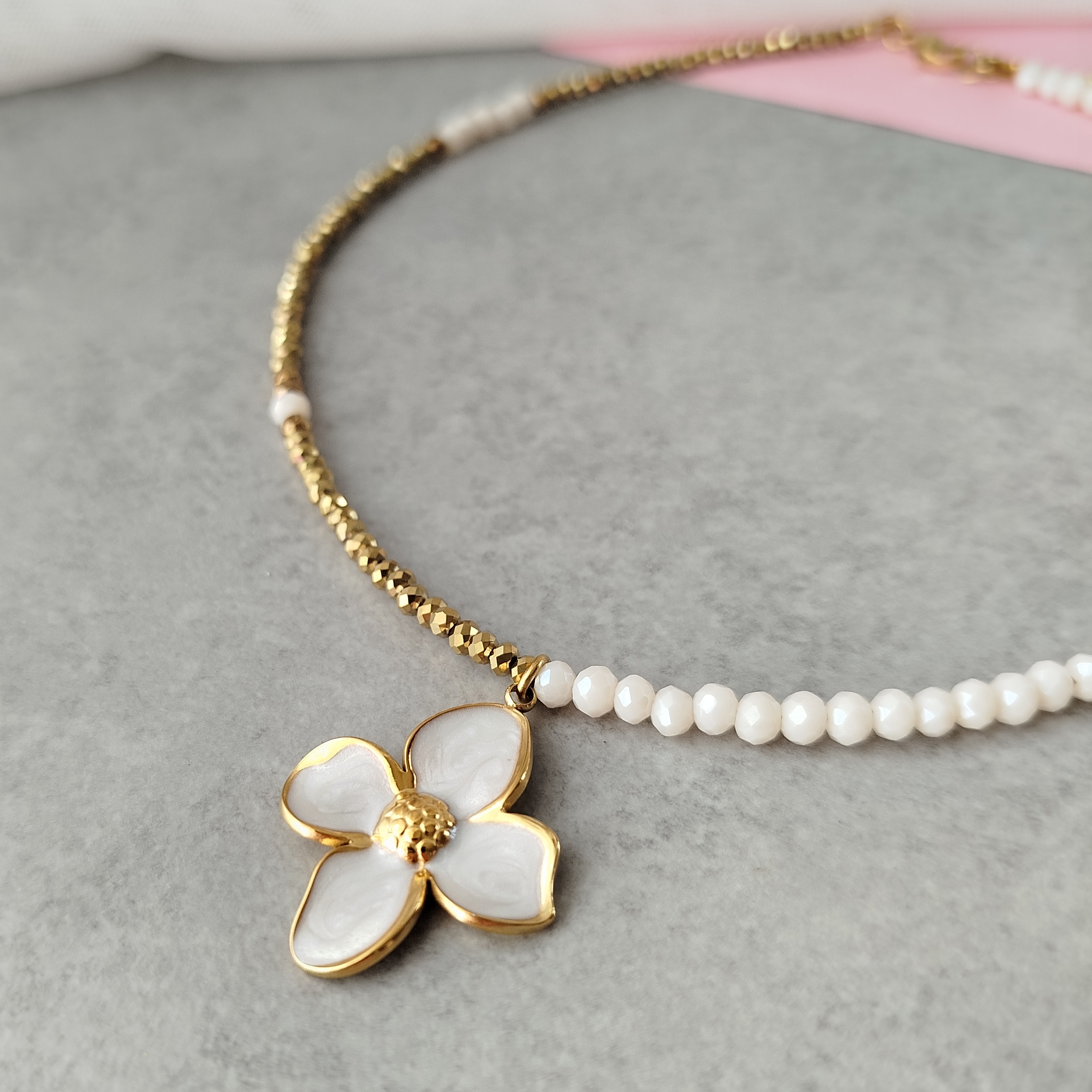 Κολιέ Amelie με ιβουάρ κρύσταλλα, αιματίτη και στοιχείο με σμάλτο. Υπέροχο, κομψό κόσμημα με λαμπερά μικρά κρύσταλλα και επιχρυσωμένες πολυγωνικές πέτρες αιματίτη. Το μενταγιόν είναι σε σχήμα λουλουδιού με σμάλτο.