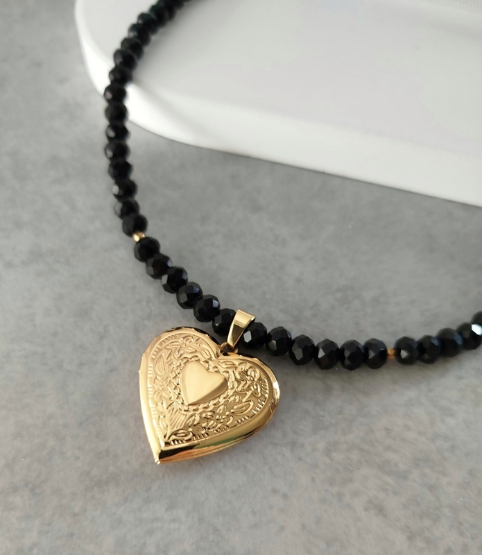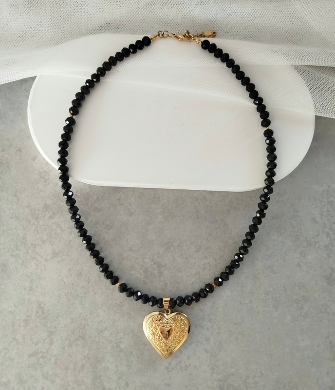 Κολιέ με μαύρα κρύσταλλα και φωτογραφοθήκη. Αυτό το κολιέ δεν είναι απλώς ένα κόσμημα· είναι ένα προσωπικό φυλαχτό γεμάτο συναίσθημα. Τα μαύρα κρύσταλλα δημιουργούν μια αίσθηση μυστηρίου, κομψότητας και δυναμισμού, αγκαλιάζοντας τον λαιμό σου με μια διακριτική αλλά έντονη λάμψη. Στο κέντρο του κολιέ κρέμεται μια ατσάλινη καρδιά που τραβά αμέσως το βλέμμα και δίνει στο κόσμημα τον πραγματικό του χαρακτήρα.