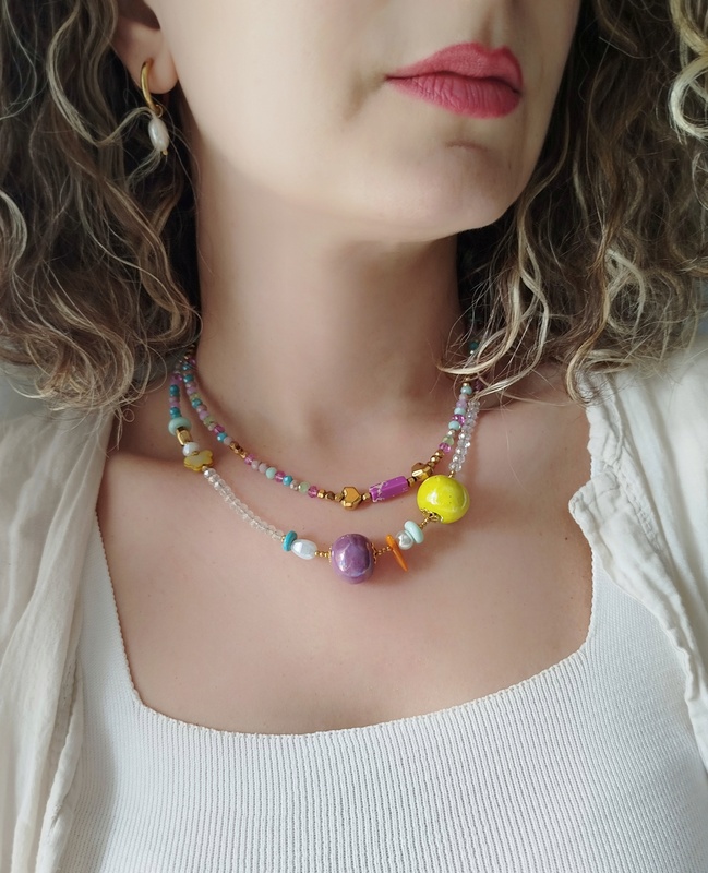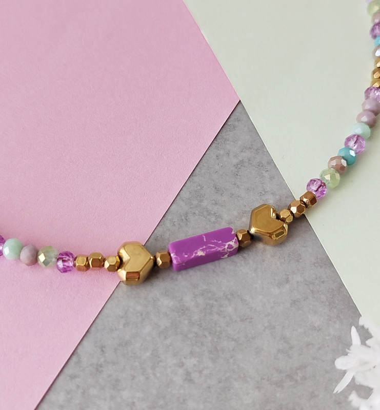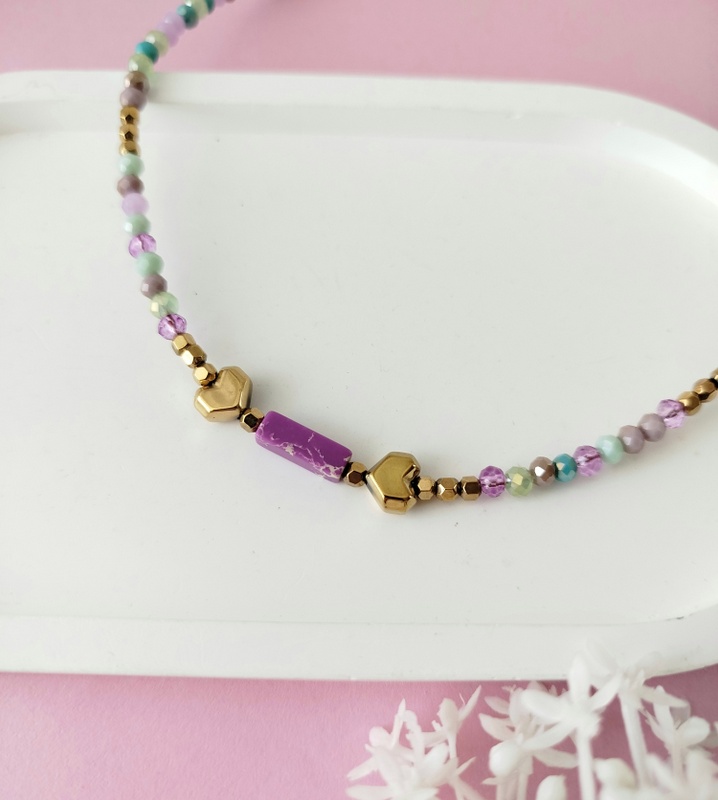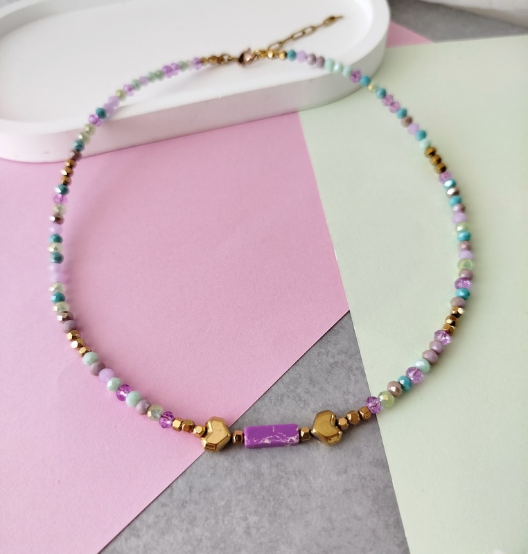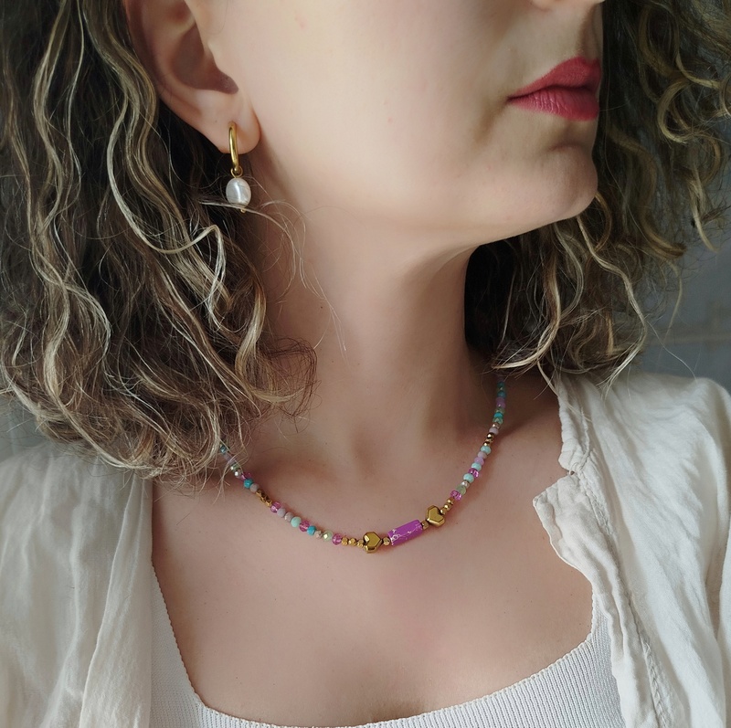 Τα mixed κρύσταλλα σε μωβ, λιλά και γαλάζιες αποχρώσεις δημιουργούν μια αρμονική χρωματική παλέτα. Κάθε κρύσταλλος αντανακλά διαφορετικά το φως, δίνοντας στο κολιέ μια ζωντανή, σχεδόν αιθέρια κίνηση. Δεν είναι ποτέ ίδιο από κάθε γωνία – κι αυτό είναι που το κάνει ξεχωριστό.
