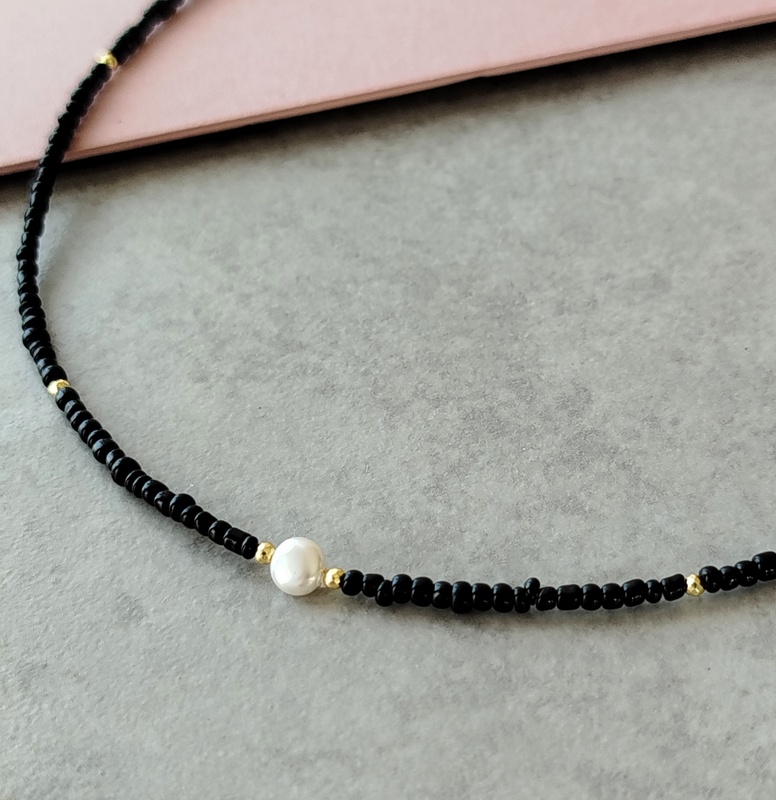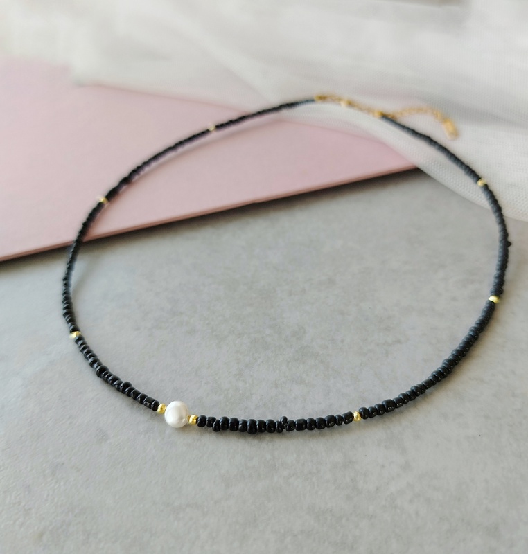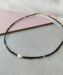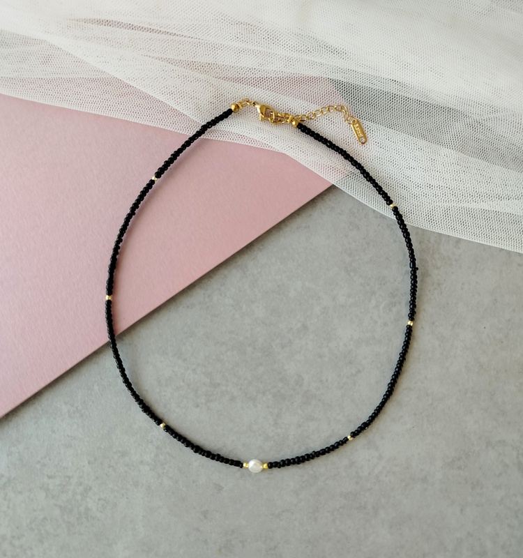 Οι μικρές χάντρες από γυαλί προσθέτουν μια ανεπαίσθητη λάμψη που παίζει όμορφα με το φως, χωρίς να δείχνει υπερβολική. Στο κέντρο, η πέρλα κλέβει την παράσταση με τη φυσική της γοητεία, προσδίδοντας στο κόσμημα μια αίσθηση καθαρότητας και θηλυκής φινέτσας. Η αρμονία ανάμεσα στις χάντρες και την πέρλα κάνει το σχέδιο μινιμαλ αλλά ταυτόχρονα εκλεπτυσμένο.