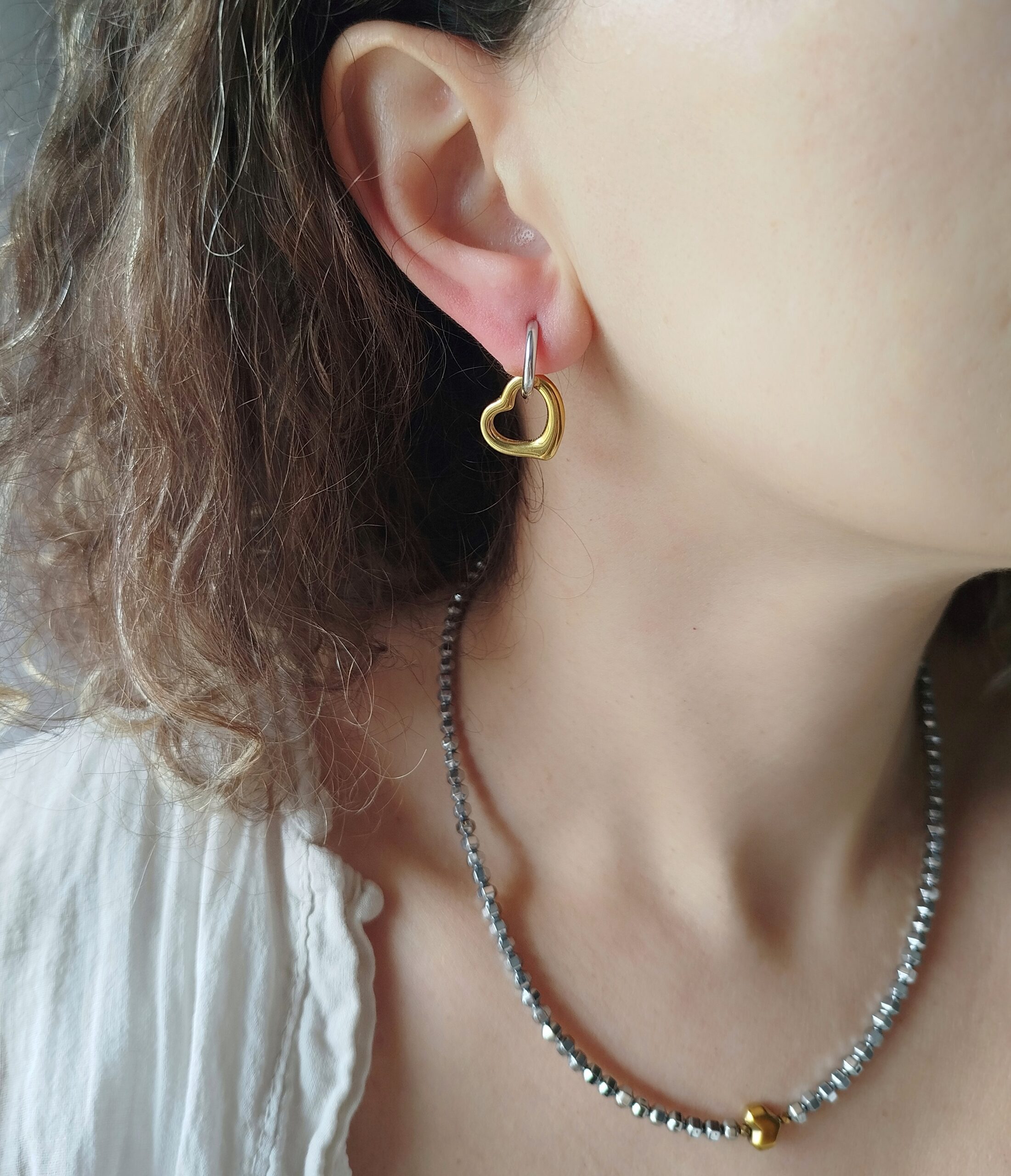 Τα σκουλαρίκια Duo Golden Hearts, είναι κομψά, ελαφριά, δίχρωμα ώστε να τα φορέσεις από το πρωί και για πολλές ώρες και να τα συνδυάσεις εύκολα με όποιο άλλο κόσμημα θέλεις. Τα κρικάκια είναι από ασημί ανοξείδωτο ατσάλι και οι μικρές καρδιές περίγραμμα από επιχρυσωμένο ανοξείδωτο ατσάλι. Αν θέλεις μπορείς εύκολα να αφαιρέσεις τα κρεμαστά στοιχεία και να φοράς τα κρικάκια σκέτα. Με τον τρόπο αυτό αποκτάς ουσιαστικά δύο ζευγάρια σκουλαρίκια.