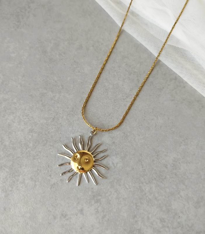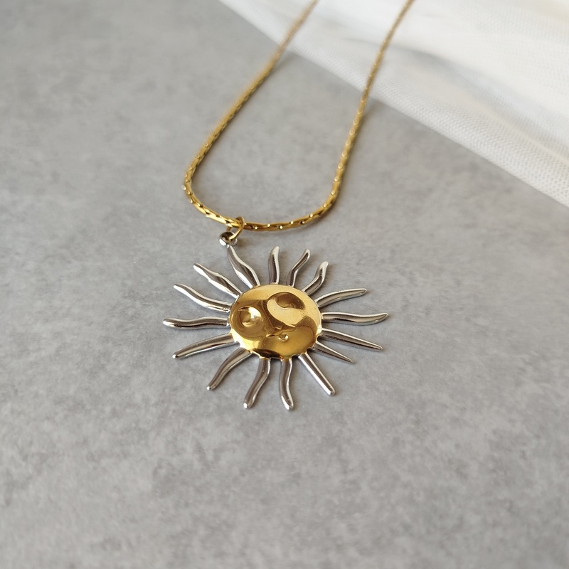 Ο ήλιος ανέκαθεν συμβόλιζε το φως, τη δύναμη και την αναγέννηση. Φορώντας αυτό το μενταγιόν, κουβαλάς μαζί σου μια υπενθύμιση αισιοδοξίας και νέας αρχής. Ο διχρωμισμός προσθέτει ιδιαίτερο χαρακτήρα στο κόσμημα, κάνοντάς το ξεχωριστό και εύκολο να συνδυαστεί με άλλα αξεσουάρ, είτε σε ασημί είτε σε χρυσούς τόνους.