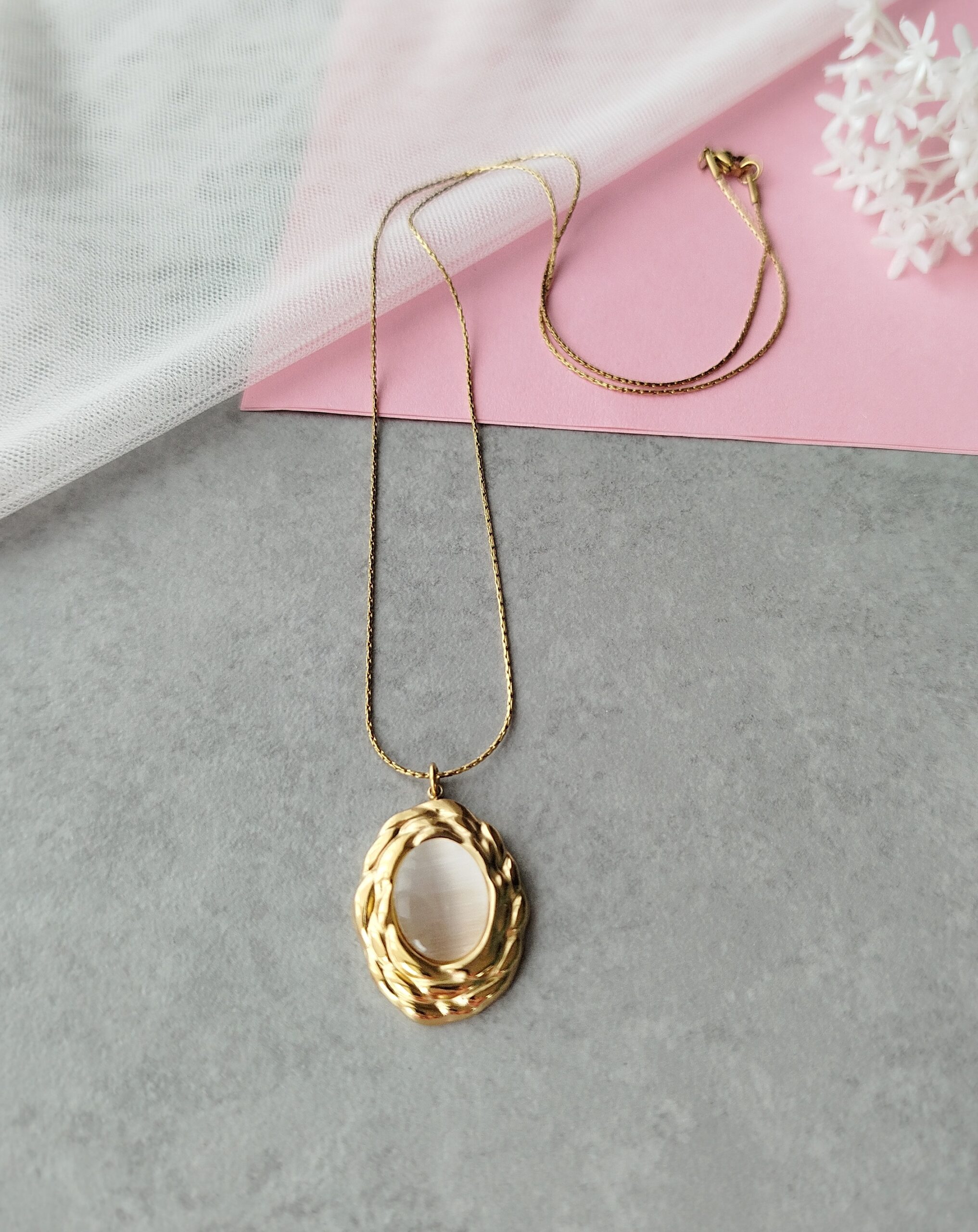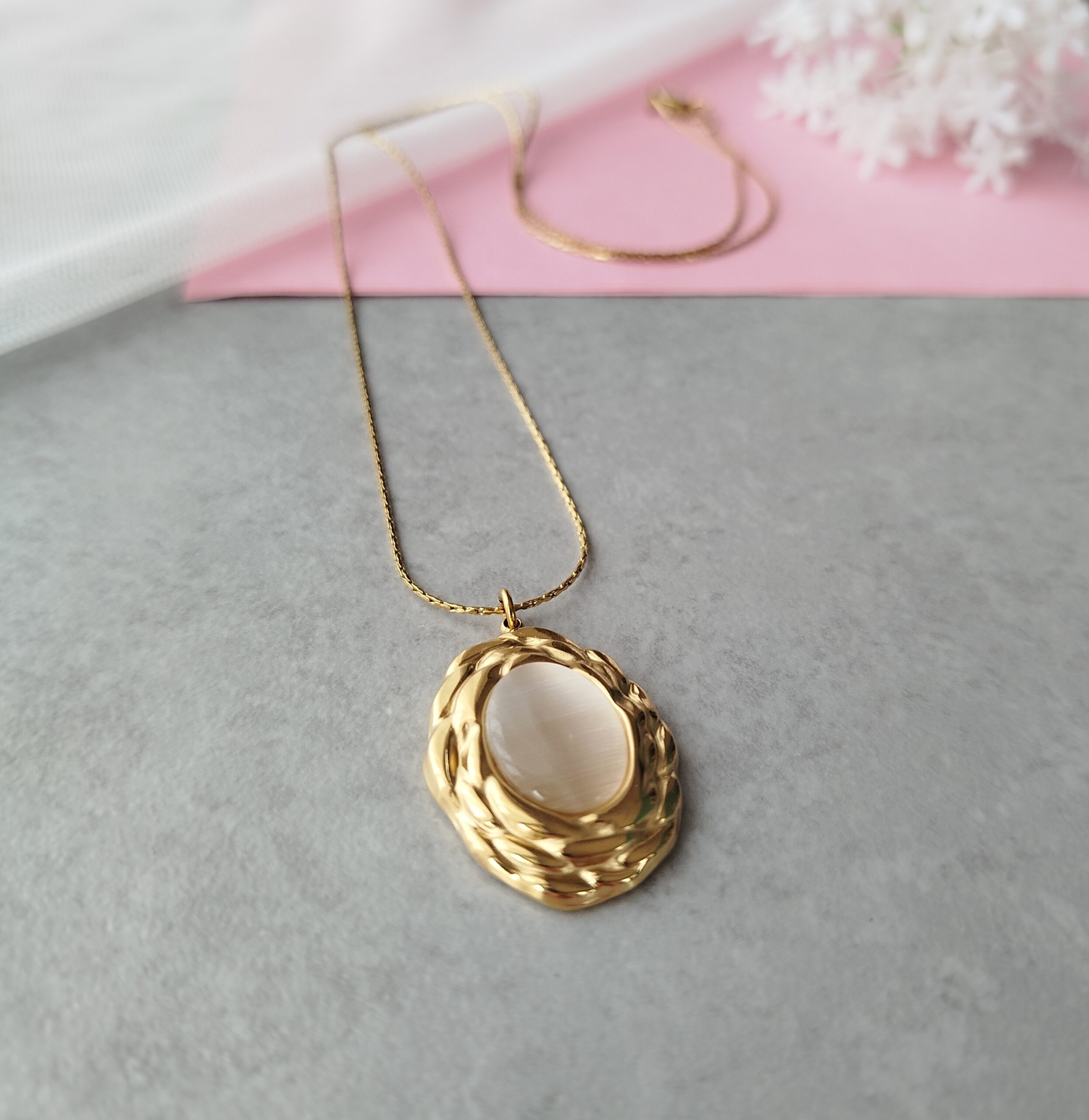 Το μενταγιόν με οβάλ σχήμα, από επιχρυσωμένο ανοξείδωτο σκαλιστό ατσάλι, με μάτι γάτας σε μπεζ χρώμα, θα στολίσει με κομψό τρόπο κάθε εμφάνισή σου.