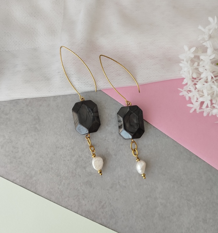 Σκουλαρίκια Iris με ανθρακί στοιχείο και μαργαριτάρι. Ένα ζευγάρι statement σκουλαρίκια, που δεν θα περάσουν απαρατήρητα. Είναι εντυπωσιακά, έχουν κίνηση και θα τα συνδυάσεις με πολλά χρώματα.