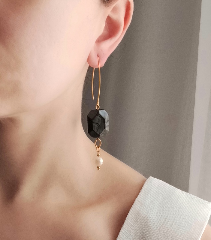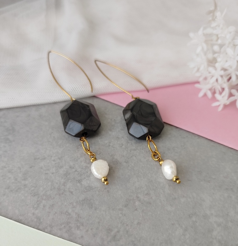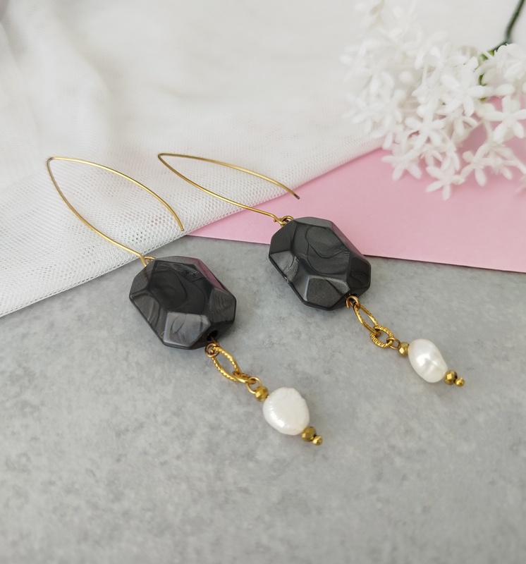 Το μακρύ γαντζάκι από επιχρυσωμένο ατσάλι κάνει τα σκουλαρίκια Iris με ανθρακί στοιχεία και μαργαριτάρια, ακόμα πιο εντυπωσιακά.