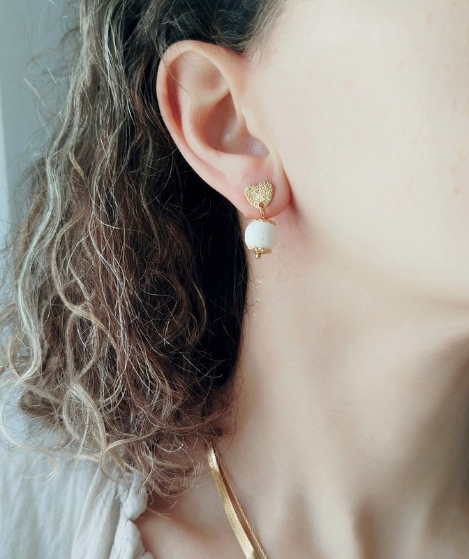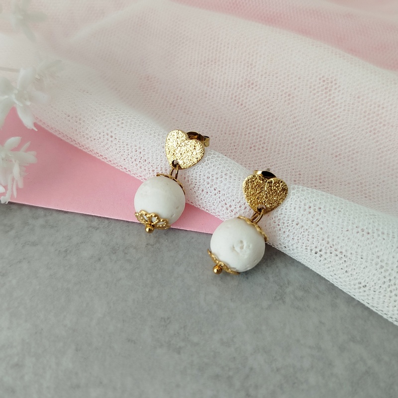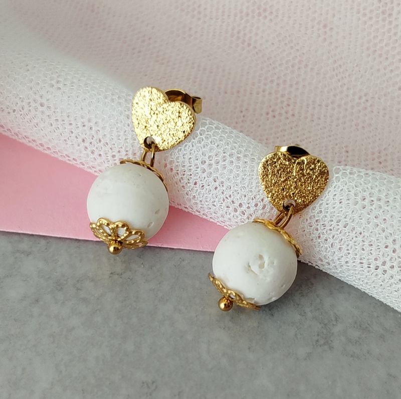 Τα κουμπώματα από ανοξείδωτο επιχρυσωμένο ατσάλι έχουν αντοχή και δεν μαυρίζουν. Το σχήμα καρδιάς κάνει τα σκουλαρίκια ιδιαίτερα και κομψά χωρίς να τα “βαραίνει”. Η λευκή λάβα σε συνδυασμό με το χρυσό είναι μία κομψή πινελιά που αναδεικνύουν κάθε outfit.