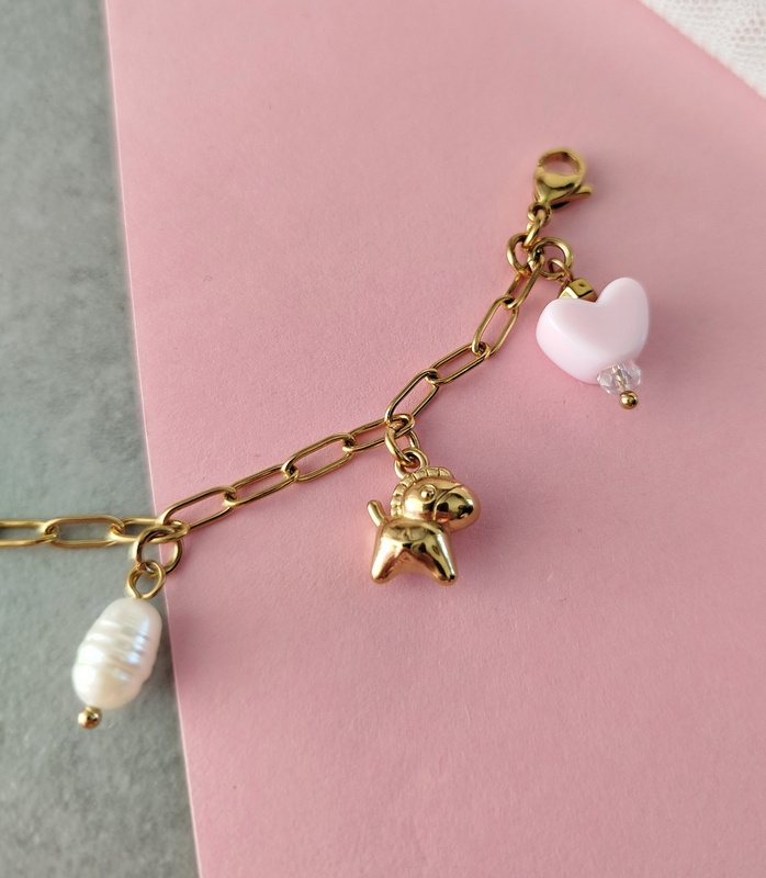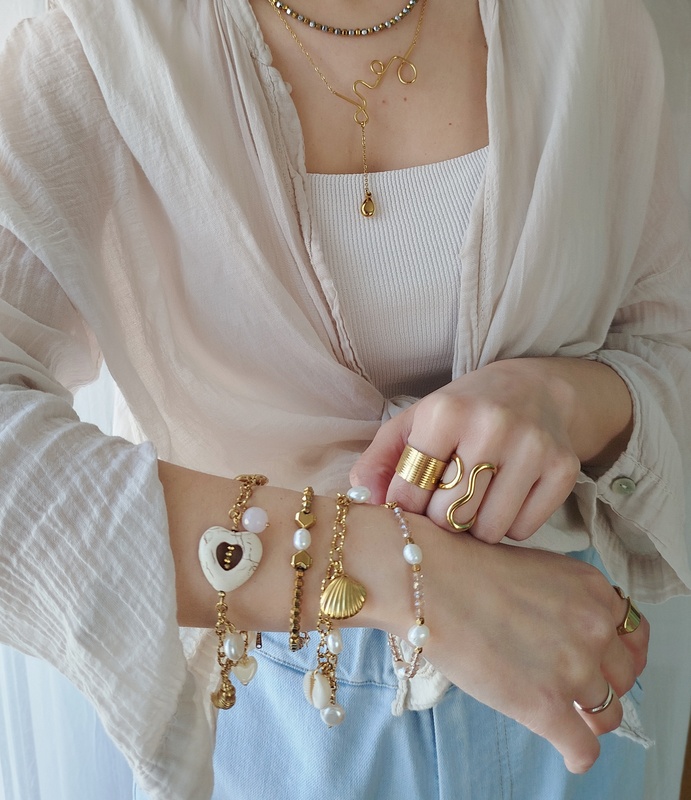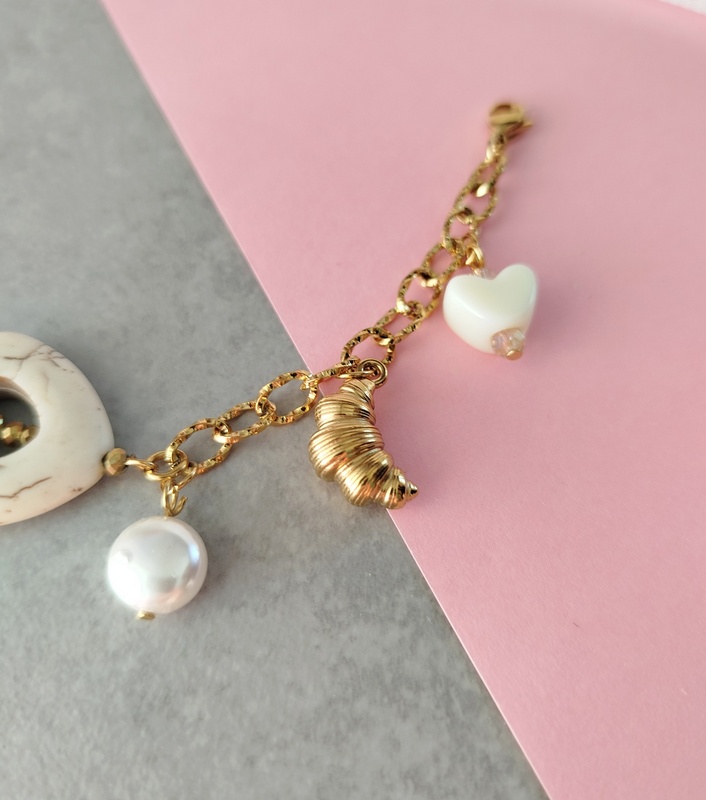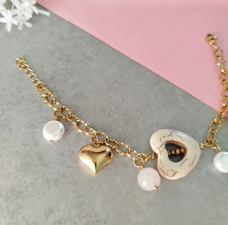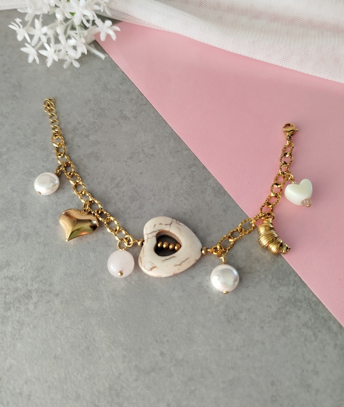 Βραχιόλι White Heart με ατσάλινη αλυσίδα. Με μεγάλο στοιχείο καρδιά από πέτρα χαολίτη, πέρλες. Με αλυσίδα και κρεμαστά στοιχεία από ανοξείδωτο ατσάλι. Είναι λαμπερό, με ουδέτερα χρώματα και θα το συνδυάσεις με όλα τα χρώματα στα outfits. Ο συνδυασμός του λευκού και του υπόλευκου με το χρυσό είναι πολύ κομψός.