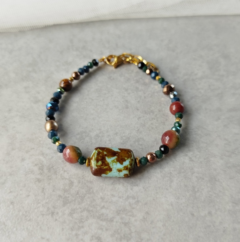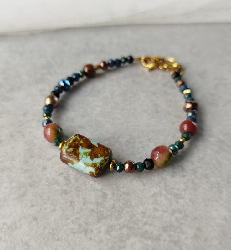 Βραχιόλι με κρύσταλλα σε σκούρα χρώματα και ημιπολύτιμη πέτρα ίασπι. Έχει μικρές χρυσές λεπτομέρειες. Είναι ένα βραχιόλι λαμπερό, διακριτικό με τα σκούρα χρώματά του και κομψό. Θα το φορέσεις με αρκετά outfits σε πολλές περιστάσεις. Είναι διακριτικό, θα το φορέσεις από το πρωί με πολλά outfits.