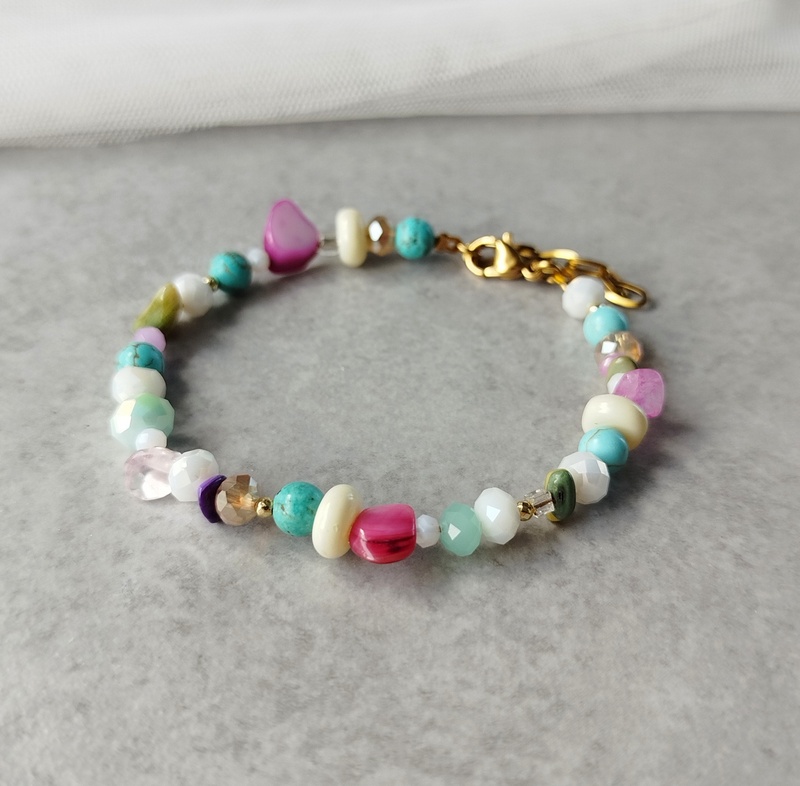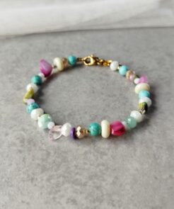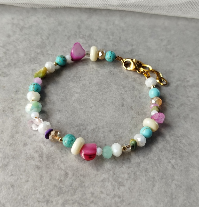 Βραχιόλι πολύχρωμο με ανοιχτά χρώματα. Έχει μικρές χρυσές λεπτομέρειες. Είναι ένα βραχιόλι που θα φορέσεις πολλές εποχές του χρόνου. Επειδή έχει πολλά χρώματα, θα το μσυνδυάσεις εύκολα με αρκετά outfits. Είναι διακριτικό, θα το φορέσεις από το πρωί με πολλά outfits.